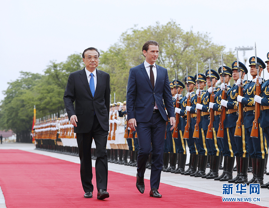 4月28日,國(guó)務(wù)院總理李克強(qiáng)在北京人民大會(huì)堂同奧地利總理庫爾茨舉行會(huì)談。這是會(huì)談前,李克強(qiáng)在人民大會(huì)堂東門外廣場(chǎng)為庫爾茨舉行歡迎儀式。新華社記者 劉彬 攝