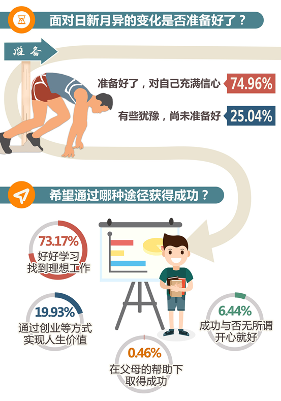 “自信”是新時(shí)代大學(xué)生最顯著的特征之一。他們首先對(duì)自己的能力充滿信心。數(shù)據(jù)顯示,80%的受訪者認(rèn)為“自己具備某一方面的才能和優(yōu)勢(shì)”,74.96%的受訪者表示“面對(duì)日新月異的世界,已經(jīng)準(zhǔn)備好了”。不少大學(xué)生每年寒暑假都去參加社會(huì)實(shí)踐,只為“積累經(jīng)驗(yàn),適應(yīng)未來”。清華大學(xué)學(xué)生崔廣鑫說,“用一年不長(zhǎng)的時(shí)間,做一件終身難忘的事”是我們西藏支教團(tuán)最浪漫的口號(hào)。浙江大學(xué)學(xué)生鐘熒說,我在努力學(xué)習(xí)專業(yè)課,既深入學(xué)習(xí)專業(yè)又拓寬知識(shí)面,了解新的技術(shù)挖掘和傳播手段,古典文獻(xiàn)學(xué)是一個(gè)相對(duì)冷門的專業(yè),但在中華傳統(tǒng)文化的繼承和發(fā)揚(yáng)過程中必不可少。