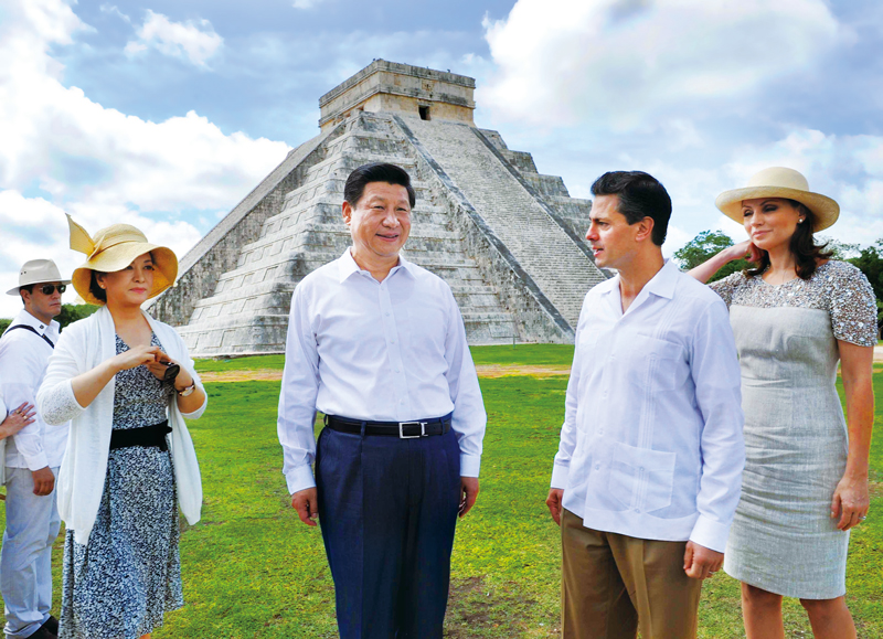 2013年6月6日,為推進(jìn)中墨兩個(gè)文明古國的文化交流,國家主席習(xí)近平應(yīng)培尼亞總統(tǒng)邀請(qǐng)參觀奇琴伊察瑪雅文明遺址。 新華社記者 饒愛民/攝