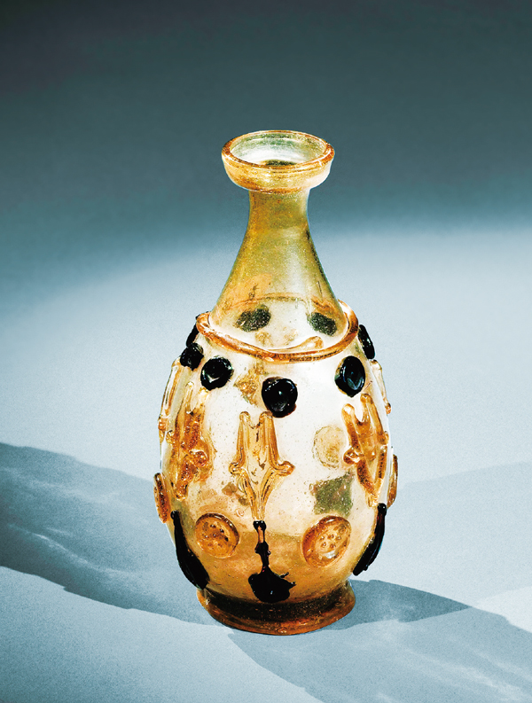 1987年,在中國陜西的法門寺,地宮中出土了20件美輪美奐的琉璃器,這是唐代傳入中國的東羅馬和伊斯蘭的琉璃器。圖為法門寺地宮中出土的盤口細(xì)頸貼塑淡黃色琉璃瓶。 法門寺博物館供圖