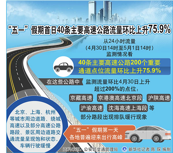圖表:“五一”假期首日40條主要高速公路流量環(huán)比上升75.9% 新華社記者 陳琛 編制