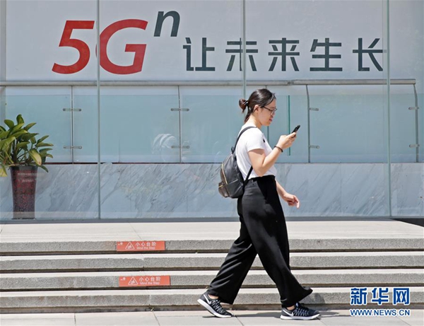 6月3日,在北京西單,一名女子從一塊5G廣告牌前走過。新華社記者 才揚 攝