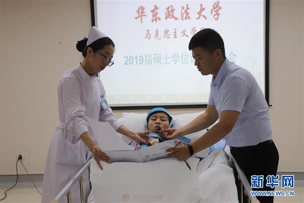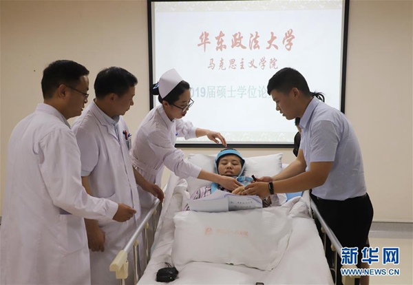 6月2日,程艷芳(中)在醫(yī)護(hù)人員和弟弟的幫助下進(jìn)行畢業(yè)論文答辯。新華社發(fā)