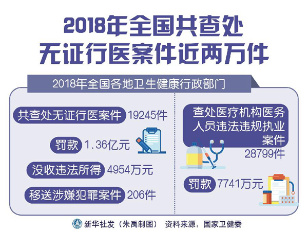 新華社北京6月25日電(記者王秉陽)國家衛(wèi)健委近日公布,2018年全國各地衛(wèi)生健康行政部門共查處無證行醫(yī)案件19245件,罰款1.36億元,沒收違法所得4954萬元,移送涉嫌犯罪案件206件;查處醫(yī)療機(jī)構(gòu)醫(yī)務(wù)人員違法違規(guī)執(zhí)業(yè)案件28799件,罰款7741萬元。