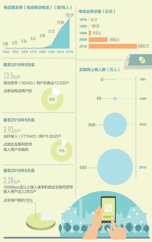 從單一種類(lèi)到多種通信方式并存。2018年,我國(guó)電話普及率(包括移動(dòng)電話)為125.29部/百人,固定互聯(lián)網(wǎng)寬帶接入用戶40738萬(wàn)戶,移動(dòng)寬帶用戶130565萬(wàn)戶,互聯(lián)網(wǎng)上網(wǎng)人數(shù)從1997年的62萬(wàn)人迅速上升至82851萬(wàn)人。用得上、用得起、用得好的信息服務(wù)正在惠及更多百姓,億萬(wàn)人民在共享互聯(lián)網(wǎng)發(fā)展成果上擁有更多獲得感、幸福感和安全感。
