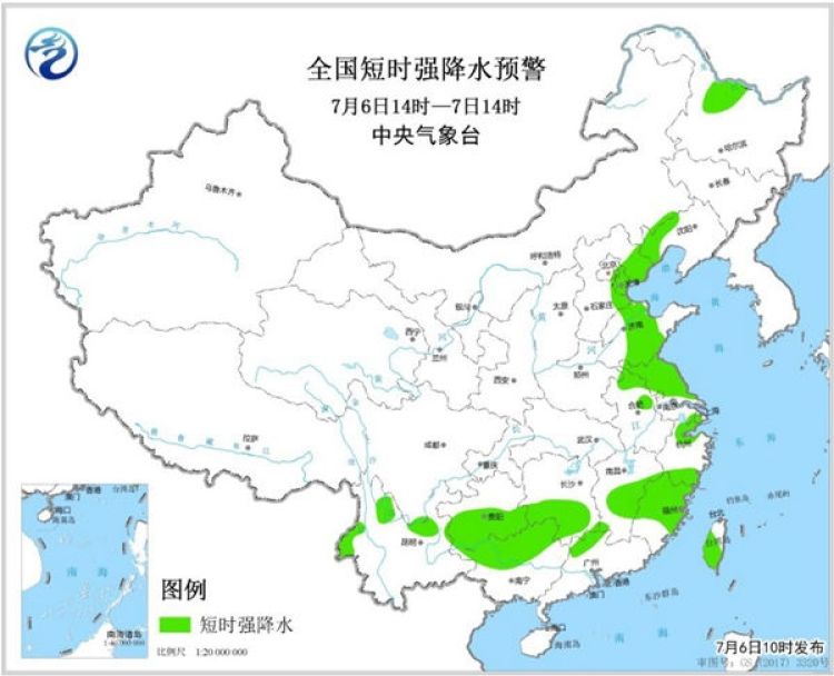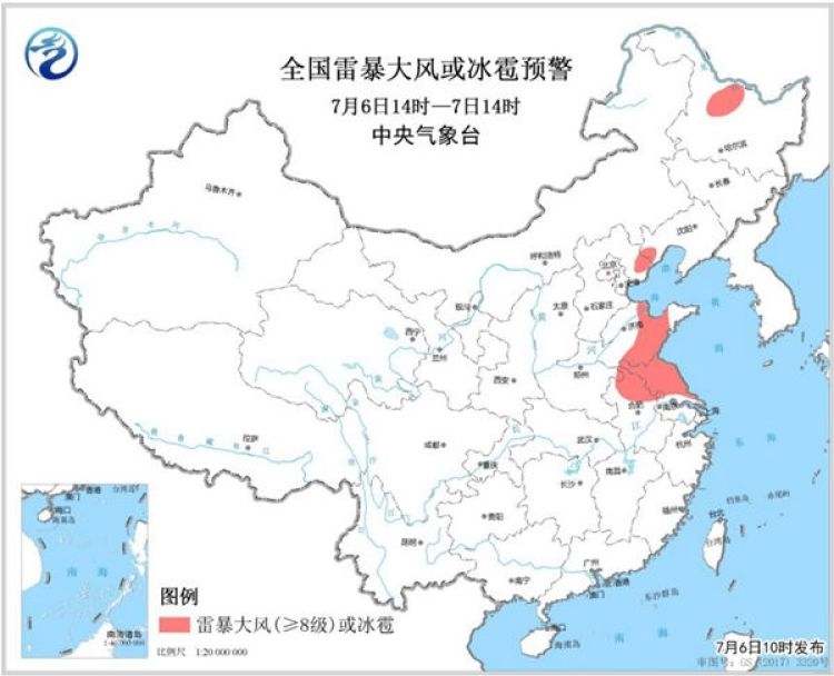 預(yù)計(jì)7月6日14時(shí)至7日14時(shí),黑龍江北部、河北東北部、山東中部、安徽北部、江蘇中北部等地的部分地區(qū)將有8-10級(jí)雷暴大風(fēng)或冰雹天氣,局地將出現(xiàn)極端雷暴大風(fēng),瞬時(shí)風(fēng)力可達(dá)10級(jí)以上;黑龍江北部、遼寧西部、河北東部、北京東部、天津、山東中部、安徽東北部、江蘇中北部、云南西部和北部、貴州南部、湖南中南部、江西中部、浙江北部和南部、福建中北部、廣西北部以及廣東北部等地的部分地區(qū)將有短時(shí)強(qiáng)降水,小時(shí)雨量20-50毫米,局地可達(dá)70毫米以上。