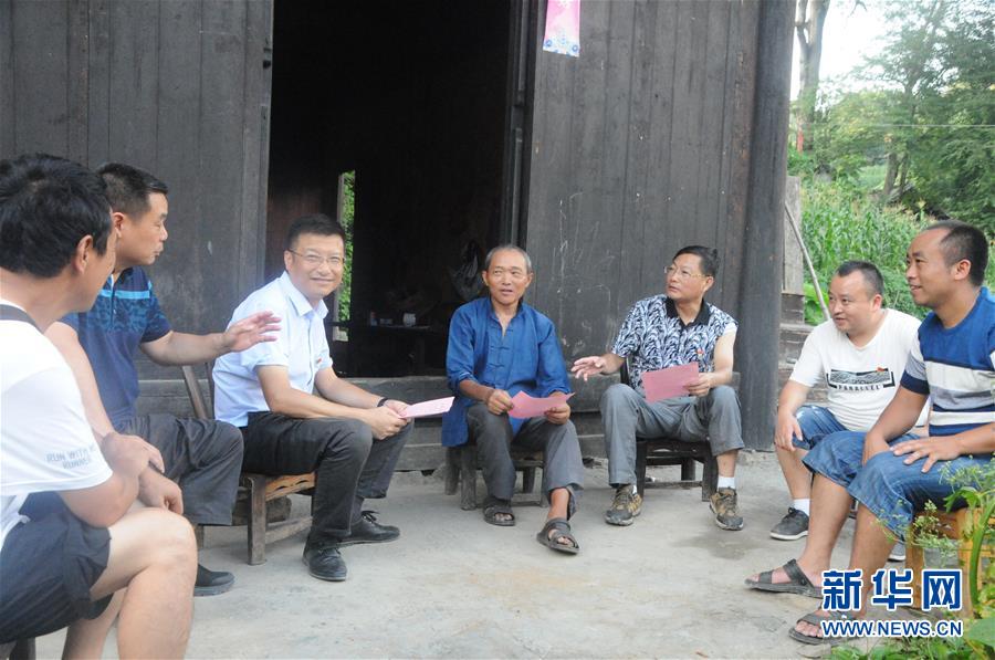 干部在湖南省古丈縣翁草村貧困戶龍自立家介紹安吉“白葉一號”項目情況(2018年7月11日攝)。新華社發(fā)