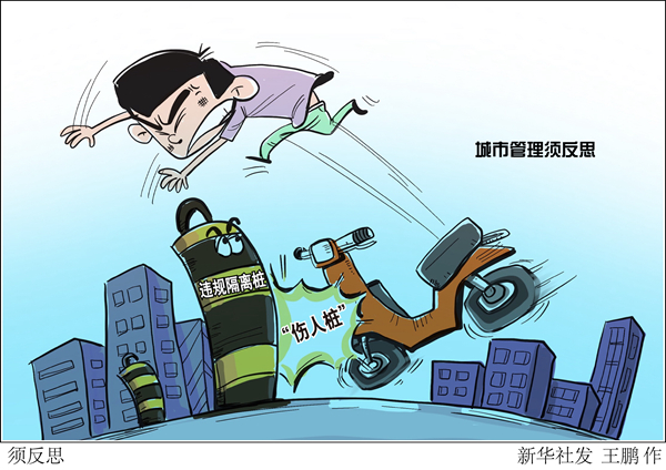 漫畫:須反思 近日,一位鄭州市民騎電動(dòng)車撞上隔離樁受傷,經(jīng)搶救無(wú)效死亡。記者在鄭州采訪了解到,醫(yī)院曾接診過很多撞隔離樁的受傷者,有的破皮流血,有的刺穿腳掌,有的摔斷腿骨。隔離樁變“傷人樁”警示城市管理不能任性粗放,應(yīng)堅(jiān)持以人為本,要像繡花一樣精細(xì),否則害民不淺。新華社發(fā) 王鵬 作