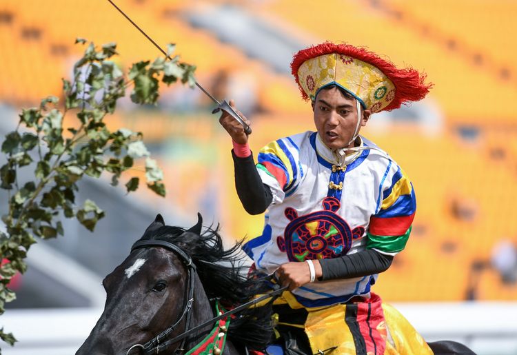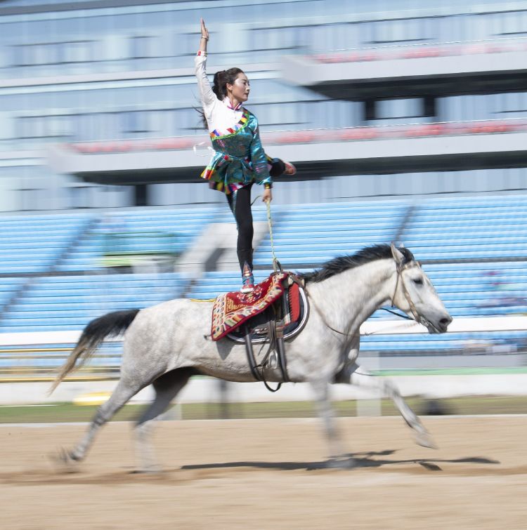 ↑西藏隊(duì)騎手進(jìn)行民族傳統(tǒng)馬術(shù)表演。