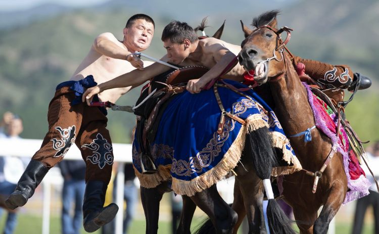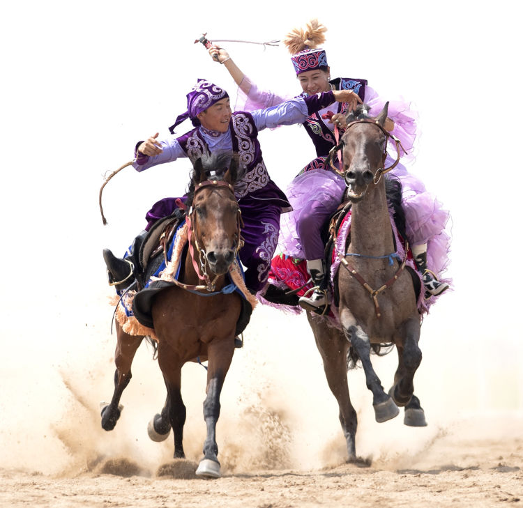 這個(gè)項(xiàng)目叫做“姑娘追”,是哈薩克族的特有馬術(shù)項(xiàng)目:一對(duì)身著盛裝的哈薩克族青年男女策馬同行,小伙子時(shí)而在姑娘耳畔傾吐心聲,時(shí)而傾身作勢(shì)擁?yè)?;姑娘則是不慍不怒,低頭不語(yǔ),只是偶爾羞赧地將過(guò)于熱情的“追求者”輕輕推開,兩匹駿馬在藍(lán)天白云下絕塵而去。