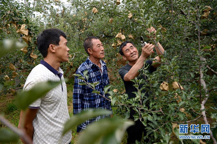 陜西延安宜川縣辛戶村村支書張延剛(右一)和村民一起查看蘋果生長(zhǎng)情況(8月3日攝)。新華社記者 劉瀟 攝