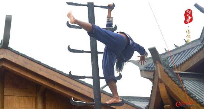 在仡佬族儺戲當(dāng)中,還有一種不可缺少的民間儀式,就是上刀梯。踩著鋒利的刀梯向上攀行、一雙赤腳卻毫發(fā)無(wú)損。這也是仡佬族人們祈福孩子平安順利成長(zhǎng)的一種方式。