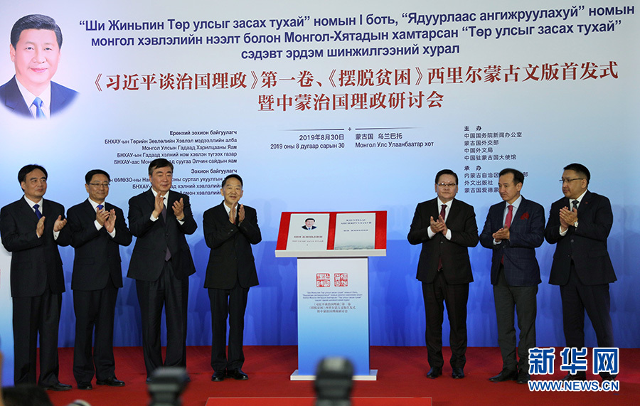 新華社烏蘭巴托8月30日電? 為慶祝中蒙建交70周年,由中國國務(wù)院新聞辦公室、蒙古國外交部、中國外文局、中國駐蒙古國大使館主辦的《習(xí)近平談治國理政》第一卷、《擺脫貧困》西里爾蒙古文版首發(fā)式暨中蒙治國理政研討會在蒙古國首都烏蘭巴托舉行。蒙古國總統(tǒng)巴特圖勒嘎發(fā)來賀信。中宣部副部長蔣建國、中國駐蒙古國大使邢海明,蒙古國副總理恩赫圖布辛、外交部長朝格特巴特爾、總統(tǒng)外事顧問特格希扎爾格勒、蒙古人民黨書記巴特恩赫等260多名代表參會。