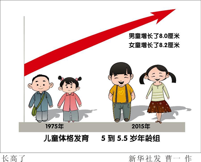國家衛(wèi)健委一項(xiàng)針對9市7歲以下兒童體格發(fā)育的調(diào)查也印證了這條“曲線”:從1975年到2015年,我國兒童身高、體重指標(biāo)均持續(xù)快速增長。以最具代表性的5到5.5歲年齡組為例,男童和女童身高分別增長了8.0厘米和8.2厘米。
