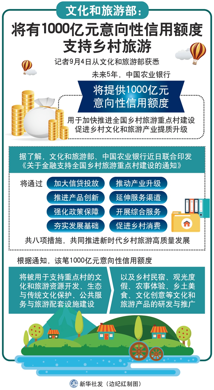 新華社北京9月4日電(記者余俊杰)記者4日從文化和旅游部獲悉,未來5年,中國農(nóng)業(yè)銀行將提供1000億元意向性信用額度,用于加快推進(jìn)全國鄉(xiāng)村旅游重點(diǎn)村建設(shè),促進(jìn)鄉(xiāng)村文化和旅游產(chǎn)業(yè)提質(zhì)升級。