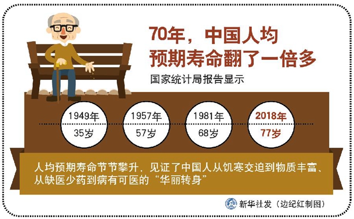 國家統(tǒng)計(jì)局報(bào)告顯示,1949年35歲,1957年57歲,1981年68歲,2018年77歲——人均預(yù)期壽命節(jié)節(jié)攀升,見證了中國人從饑寒交迫到物質(zhì)豐富、從缺醫(yī)少藥到病有可醫(yī)的“華麗轉(zhuǎn)身”——