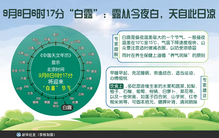 新華社天津9月6日電(記者周潤?。皯{闌久,金波漸轉(zhuǎn),白露點(diǎn)蒼苔。”《中國天文年歷》顯示,北京時間9月8日6時17分將迎來“白露”節(jié)氣。專家提醒說,此時節(jié)“秋老虎”將逝去,氣溫開始下降,天氣逐漸轉(zhuǎn)涼,公眾要注意養(yǎng)氣潤燥。