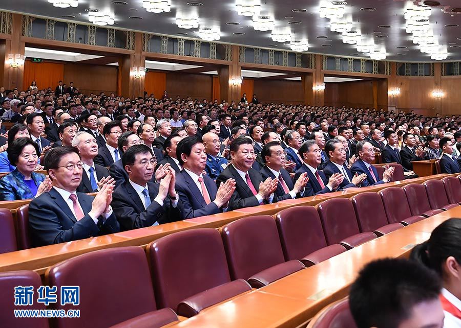 人民大會(huì)堂萬人大禮堂處處歡聲笑語。二樓眺臺(tái)的橫幅格外醒目:緊密團(tuán)結(jié)在以習(xí)近平同志為核心的黨中央周圍,不忘初心、牢記使命,奮力奪取新時(shí)代中國特色社會(huì)主義偉大勝利!大會(huì)堂天幕上,投映著姹紫嫣紅的鮮花圖案,營造出熱烈喜慶的氣氛。兩面紅旗造型的舞臺(tái)墻矗立在臺(tái)口,36名儀仗兵分列兩側(cè)。