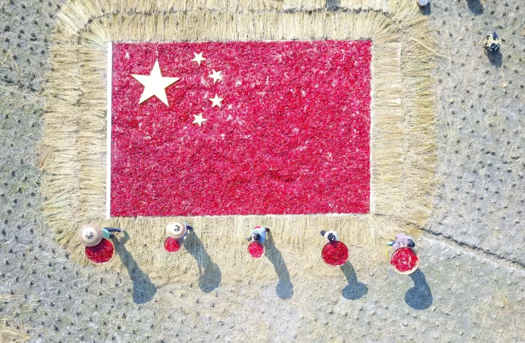 2019年9月30日,貴州凱里。舟溪鎮(zhèn)曼洞村的村民用辣椒拼出國(guó)旗圖案,以樸實(shí)的方式表達(dá)對(duì)祖國(guó)的熱愛和美好祝福。作者:紫氣東來(lái)