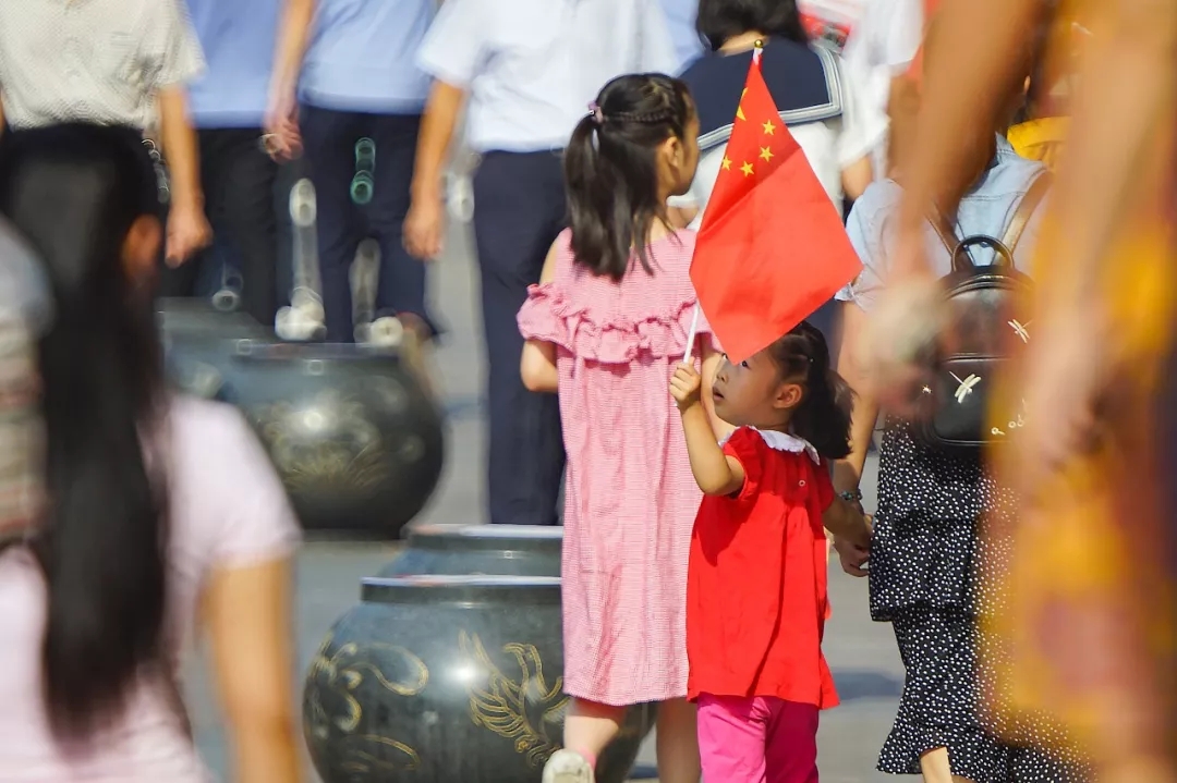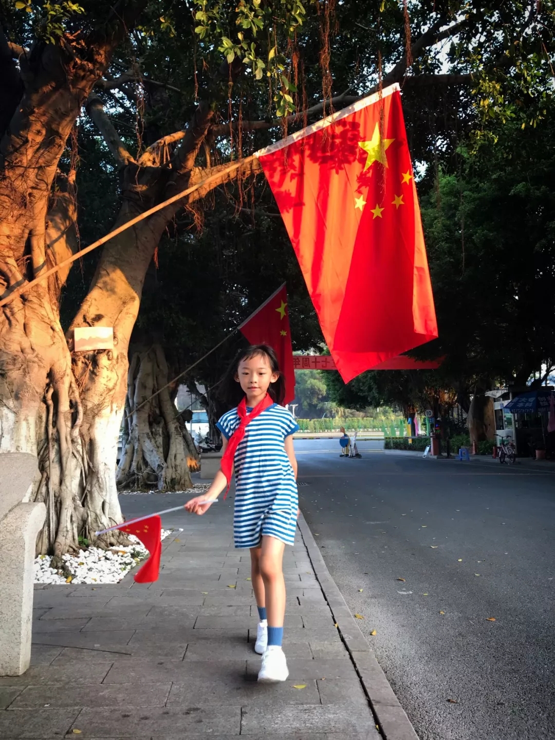 2019年10月1日,江西鷹潭。身著紅衣的小女孩回頭看了看和自己衣服一樣顏色的國(guó)旗。作者:咖喱給給