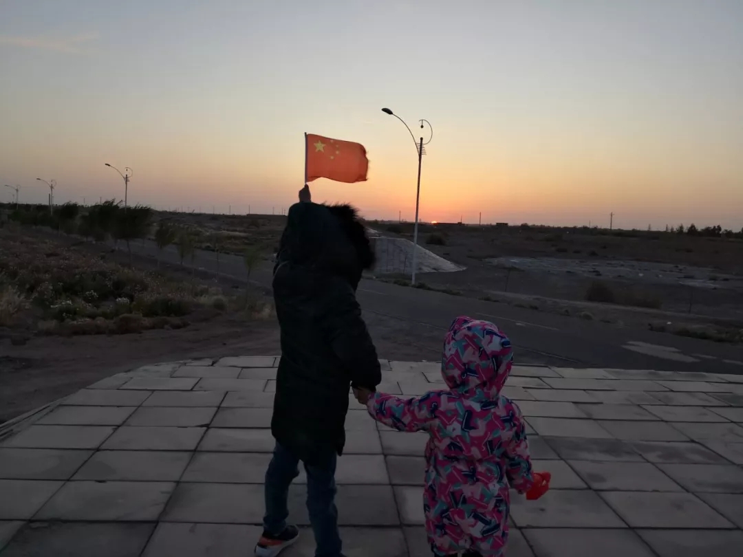 2019年10月1日,酒泉衛(wèi)星發(fā)射中心。今天是國(guó)慶節(jié),孩子們一起看日出。作者:黃建敏