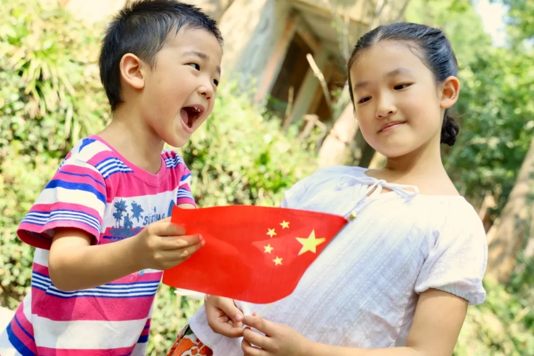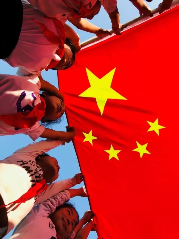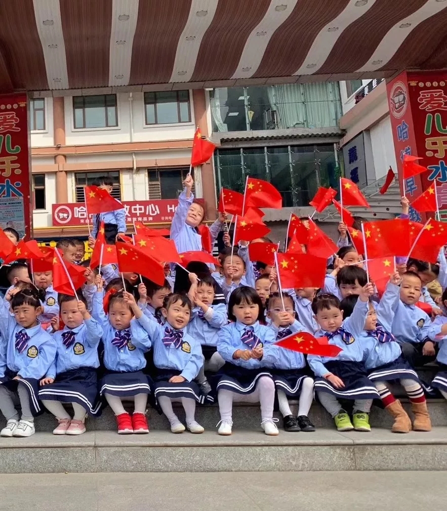 2019年9月28日,甘肅甘谷。幼兒園的小朋友歡快地?fù)]動(dòng)手中的五星紅旗,祝福祖國(guó)生日快樂!作者:草野沐風(fēng)