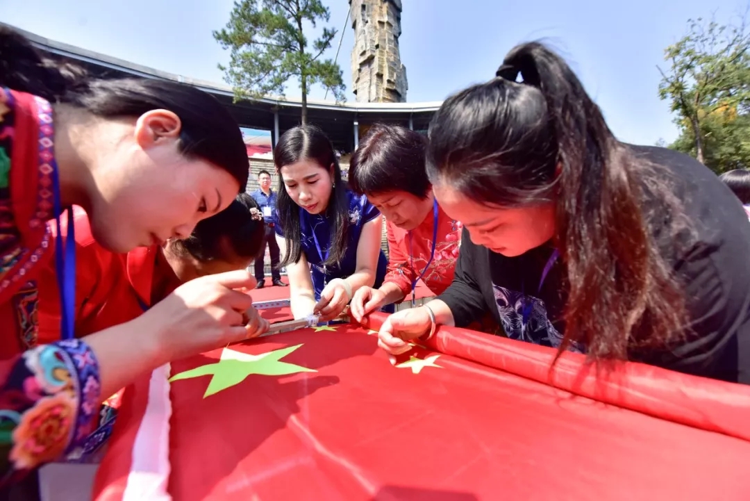 2019年9月28日,湖南張家界大峽谷景區(qū)。參加“壯麗七十年 繡出新時(shí)代”的武陵山(張家界)首屆刺繡大賽活動(dòng)的評(píng)委們?cè)诒荣惉F(xiàn)場(chǎng)集體繡出一面鮮艷的五星紅旗。作者:歐小芳