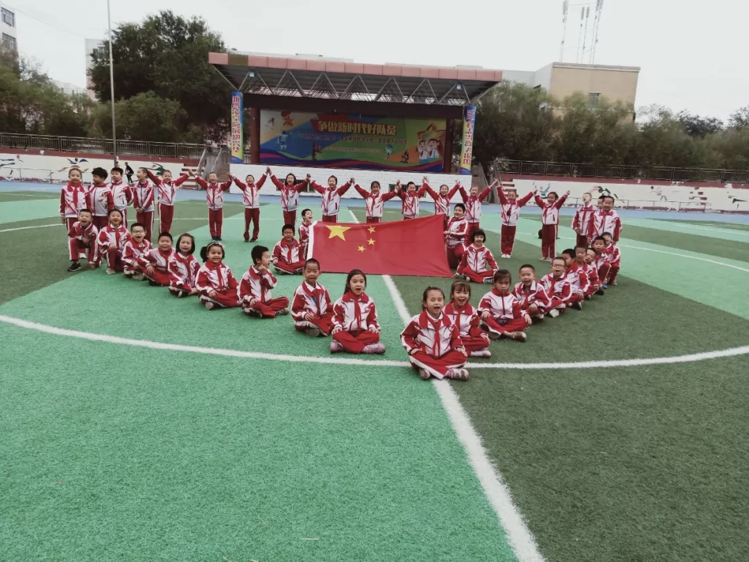 2019年9月26日,江蘇邳州。鐵富鎮(zhèn)中心小學(xué)少先隊(duì)員們手擎國(guó)旗,祝福祖國(guó)生日快樂!作者:時(shí)光漫步