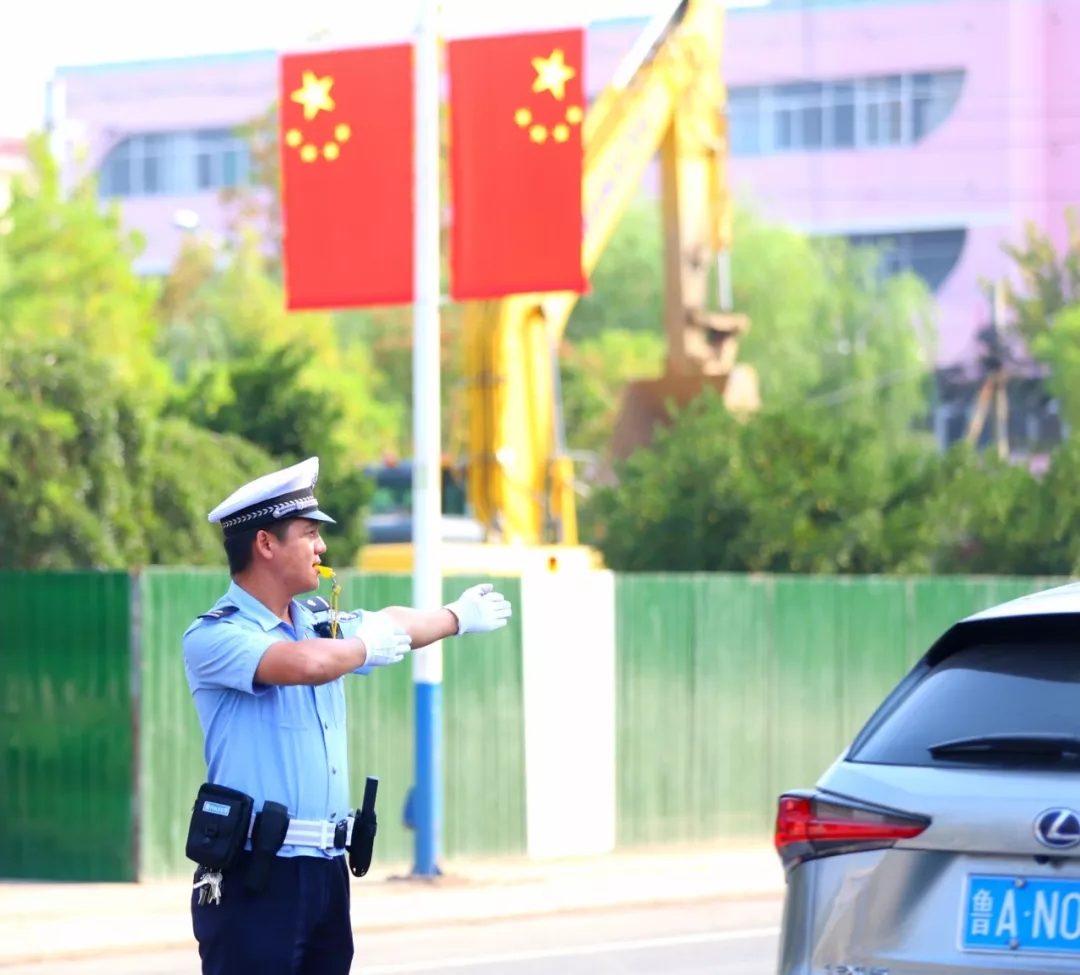 2019年9月30日,山東濟(jì)陽(yáng)。國(guó)旗下,交通警察在指揮車輛行駛。作者:墨影耕耘——?jiǎng)⒆悠?/font>