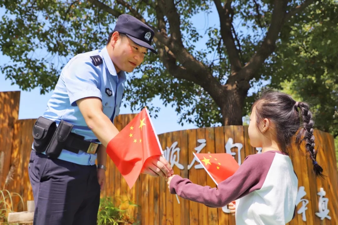 2019年9月23日,江蘇揚(yáng)中。小朋友看到執(zhí)勤的警察叔叔,遞上了手中的國(guó)旗。作者:曉媛