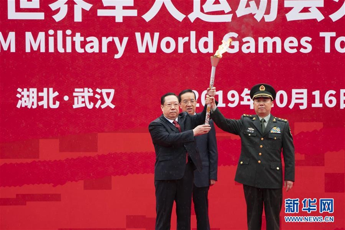 10月16日,第七屆世界軍人運動會組委會副主席黎火輝(前右)將點火棒交給湖北省人民政府省長王曉東(前左)。當日,第七屆世界軍人運動會火炬?zhèn)鬟f活動在武漢東湖綠道舉行。新華社記者 熊琦 攝