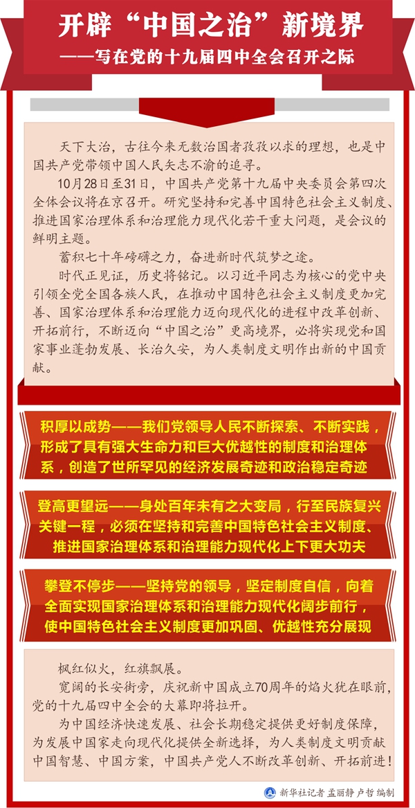 新華社北京10月27日電 題:開(kāi)辟“中國(guó)之治”新境界——寫(xiě)在黨的十九屆四中全會(huì)召開(kāi)之際