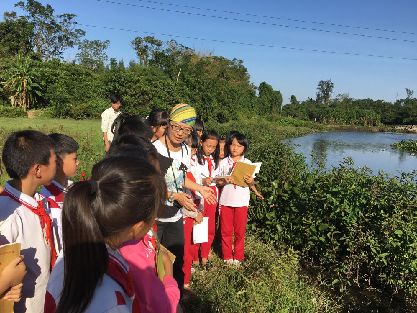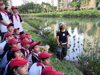海南松鼠學堂創(chuàng)始人高高老師帶領??谄咧械膶W生觀察濕地的生態(tài)環(huán)境