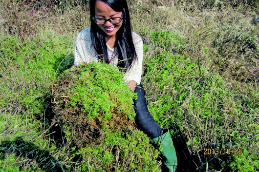 2013年10月26日,劉玲在山坳里采野生水苔。受訪者供圖