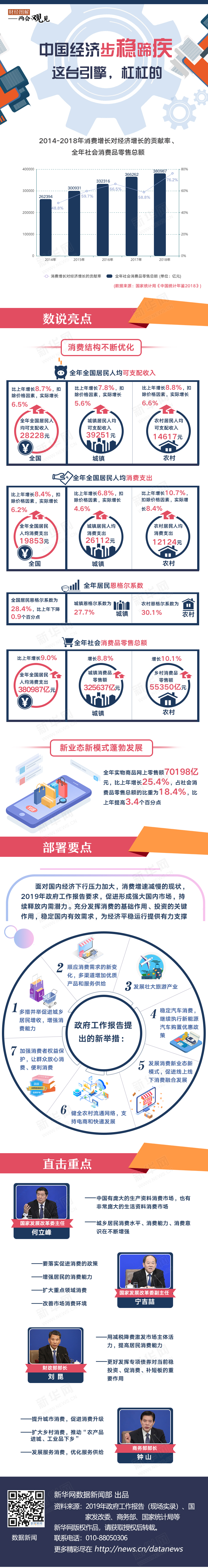 新華網(wǎng)北京3月9日電(劉緒堯 何凡) 2018年消費的增長對經(jīng)濟(jì)增長的貢獻(xiàn)達(dá)到76.2%,已連續(xù)五年成為拉動經(jīng)濟(jì)增長的主引擎,消費結(jié)構(gòu)不斷優(yōu)化,教育、文化、娛樂、醫(yī)療保健等服務(wù)消費支出比例穩(wěn)步提高。當(dāng)前,我國整個國民經(jīng)濟(jì)13.6萬億美元的總量當(dāng)中,消費總量已超過8萬億美元。未來如何更充分地發(fā)揮消費的基礎(chǔ)作用?且看政府工作報告如何部署。