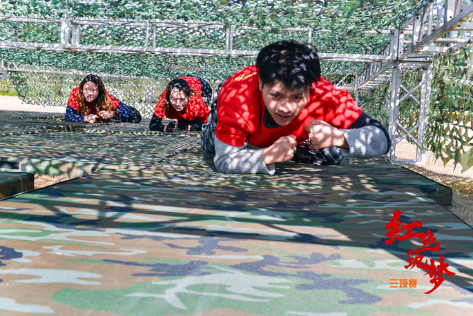 上午九時,一支隊伍正合力將長繩和70面國旗串聯(lián)懸掛至旗海中,讓人聯(lián)想起第一面五星紅旗在開國大典廣場上飄揚的場景;另一支隊伍的幾位隊員正用PVC管作為連接,合力吹氣將5個氫氣球吹爆,這是在通過游戲的形式致敬1967年的第一顆氫彈爆炸成功;還有一群隊員穿著救生衣、膠鞋扛著自己的隊友穿越洪水區(qū)、獨木橋區(qū)、沼澤地區(qū),還原98 年抗洪搶險、5.12抗震救災的場景……