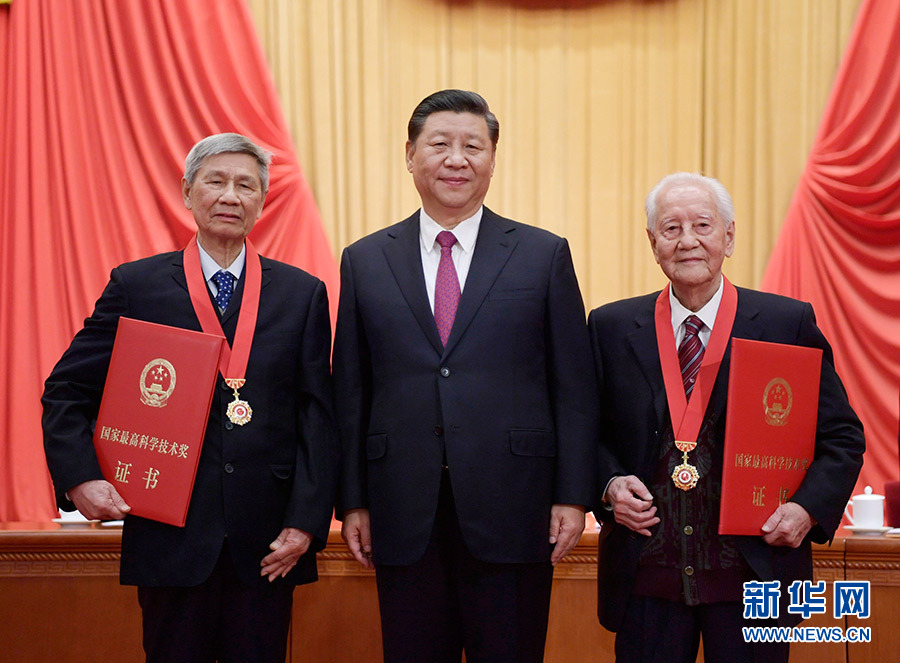 1月10日,2019年度國家科學(xué)技術(shù)獎勵大會在北京人民大會堂隆重舉行。中共中央總書記、國家主席、中央軍委主席習(xí)近平向獲得2019年度國家最高科學(xué)技術(shù)獎的原中國船舶重工集團公司第七一九研究所黃旭華院士(右)和中國科學(xué)院大氣物理研究所曾慶存院士(左)頒獎。 新華社記者 李學(xué)仁 攝