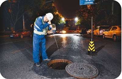 蔣師傅講起聽漏的學(xué)問:一般先利用相關(guān)設(shè)備,一個(gè)井蓋一個(gè)井蓋地排查,根據(jù)聽到的漏水聲確定漏點(diǎn)的范圍。