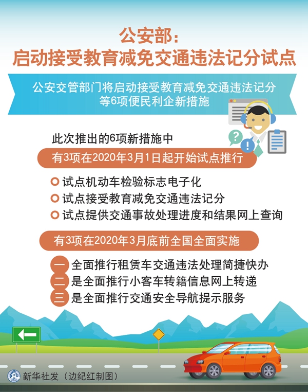 新華社北京1月14日電(劉奕湛、楊凌偉)記者14日從公安部了解到,公安交管部門將啟動(dòng)接受教育減免交通違法記分等6項(xiàng)便民利企新措施。此次推出的6項(xiàng)新措施中有3項(xiàng)在2020年3月1日起開始試點(diǎn)推行,另有3項(xiàng)在2020年3月底前全國(guó)全面實(shí)施。