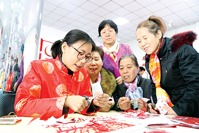 山東淄博市張店區(qū)開展“迎新春·情暖冬日”活動,組織機(jī)關(guān)干部教群眾剪窗花。