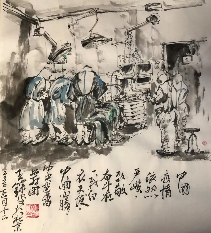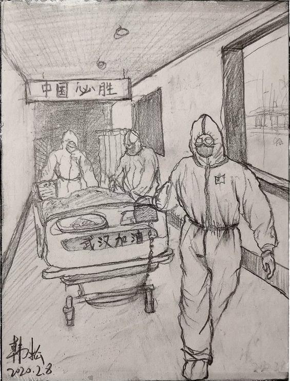 素描畫《一方有難,八方支援!》作者:中央芭蕾舞團(tuán)燈光設(shè)計(jì) 周杉行也