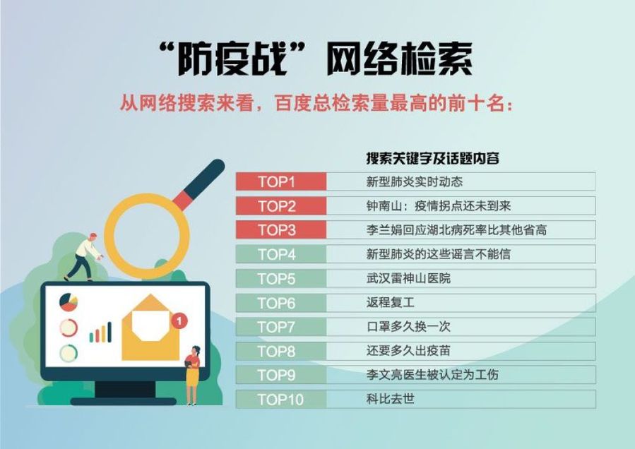 在百度搜索平臺(tái),日均超過(guò)10億人次搜索與“新冠肺炎”疫情有關(guān)的消息?!扮姞敔敗?、“李奶奶”的發(fā)言最受關(guān)注,排名熱搜前列。