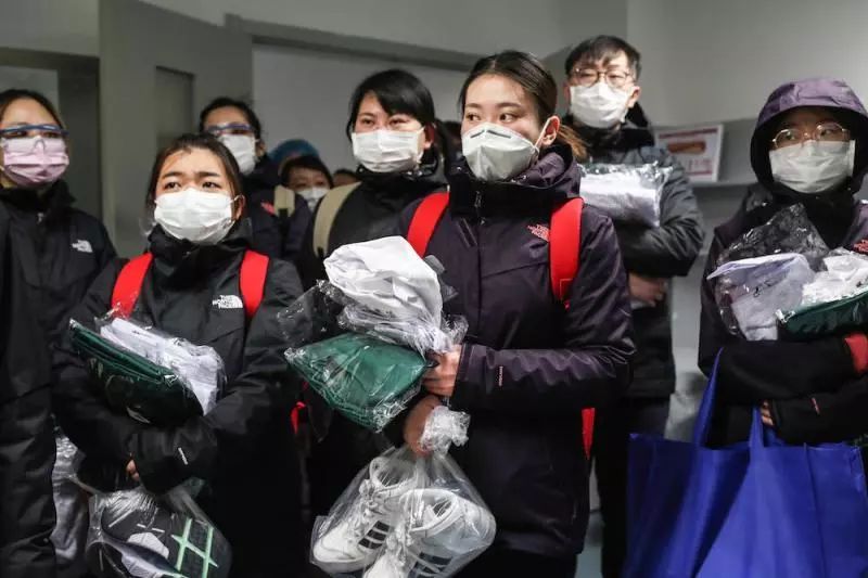 (在前往醫(yī)院前,隊員們在駐地領(lǐng)取病房工作服)