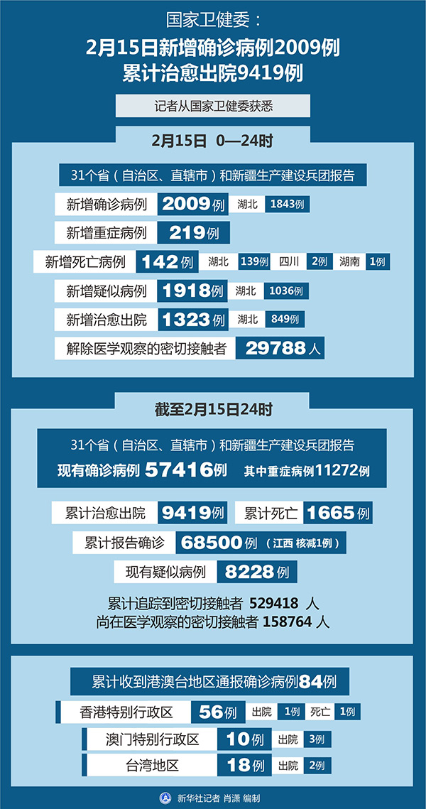 截至2月15日24時,據(jù)31個?。ㄗ灾螀^(qū)、直轄市)和新疆生產(chǎn)建設(shè)兵團(tuán)報告,現(xiàn)有確診病例57416例(其中重癥病例11272例),累計治愈出院病例9419例,累計死亡病例1665例,累計報告確診病例68500例(江西省核減1例),現(xiàn)有疑似病例8228例。累計追蹤到密切接觸者529418人,尚在醫(yī)學(xué)觀察的密切接觸者158764人。