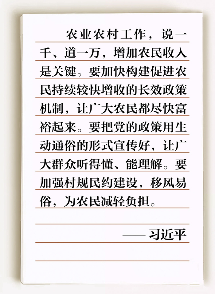 “致富路越走越寬,日子越過(guò)越紅火,全靠黨的政策好??倳?shū)記高興地說(shuō),農(nóng)業(yè)農(nóng)村工作,說(shuō)一千、道一萬(wàn),增加農(nóng)民收入是關(guān)鍵?!?/font>