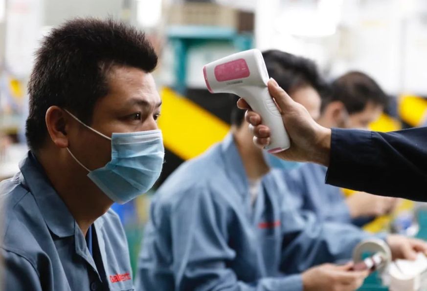 2月10日,廣東格蘭仕集團有限公司順德總部車間生產線上的員工測體溫。新華社記者 黃國保 攝