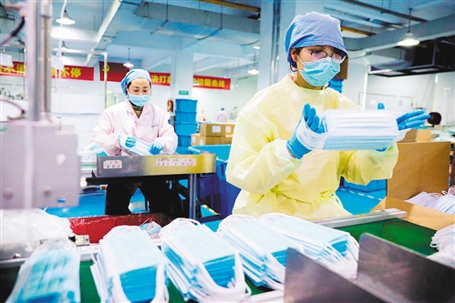 2月14日,浙江省長興縣和平鎮(zhèn)長興美迪康無紡布制品有限公司員工加緊生產口罩。 許 旭攝(中經視覺)