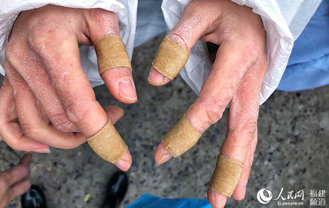 “我每天只能通過(guò)視頻和媽媽聊天?!敝x小燕每天早出晚歸,母子倆很難見(jiàn)上一面。曾元博說(shuō),因?yàn)閶寢屆刻焐舷掳喽家M(jìn)行嚴(yán)格消毒,雙手已經(jīng)被干裂出一道道血口?!皨寢尩氖忠呀?jīng)干裂得不成樣子了,一使勁就會(huì)流血,真讓我們心疼?!?/p>