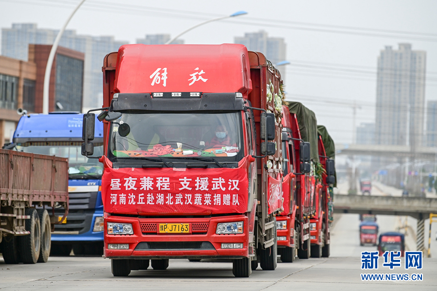3月1日,河南沈丘退伍老兵王國輝帶隊(duì)第三次來到武漢送菜,將沈丘縣委縣政府采購的130噸農(nóng)副產(chǎn)品捐贈給武漢。 新華社發(fā)(侯建勛 攝)