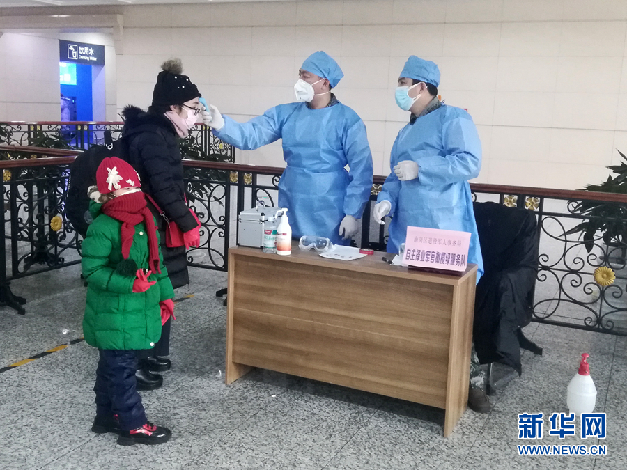 2月14日,黑龍江哈爾濱68名自主擇業(yè)軍轉(zhuǎn)干部組成的“橄欖綠疫情防控志愿服務(wù)隊(duì)”隊(duì)員在火車站為旅客測量體溫。 新華社發(fā)(韓振忠 攝)